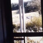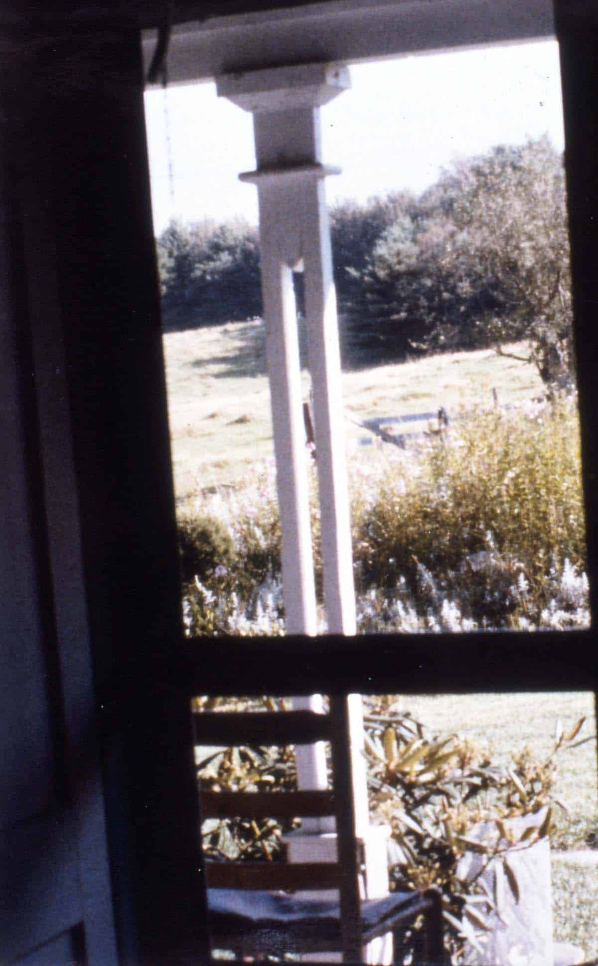 Looking out the screen door at Chogyam Trungpa’s retreat house in Charlemont, Massachusetts, 1976/77. Photographer unknown.