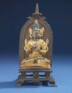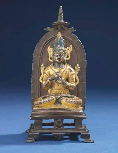 Onto the disk of the autumn moon, clear and pure, you transplant a seed syllable. Cool blue rays of the seed syllable radiate immense, cooling compassion beyond the limits of space, which fulfill the needs and desires of sentient beings. They radiate basic warmth, so that the confusion of sentient beings may be clarified. Then, from the seed syllable you create a buddha, Mahavairochana, white in color, with the features of an aristocrat, with the appearance of an eight-year-old child: beautiful, innocent, and pure, with a powerful royal gaze. He is dressed in the royal robes of the Vedic age or the medieval Indian royal costume. He wears a golden crown inlaid with wish-fulfilling jewels. Half of his long dark hair is made into a topknot, and the other half floats over his shoulders and back. He is seated cross-legged on the lunar disk with his hands in the meditation mudra, holding a vajra in his hand that is carved of pure white crystal.